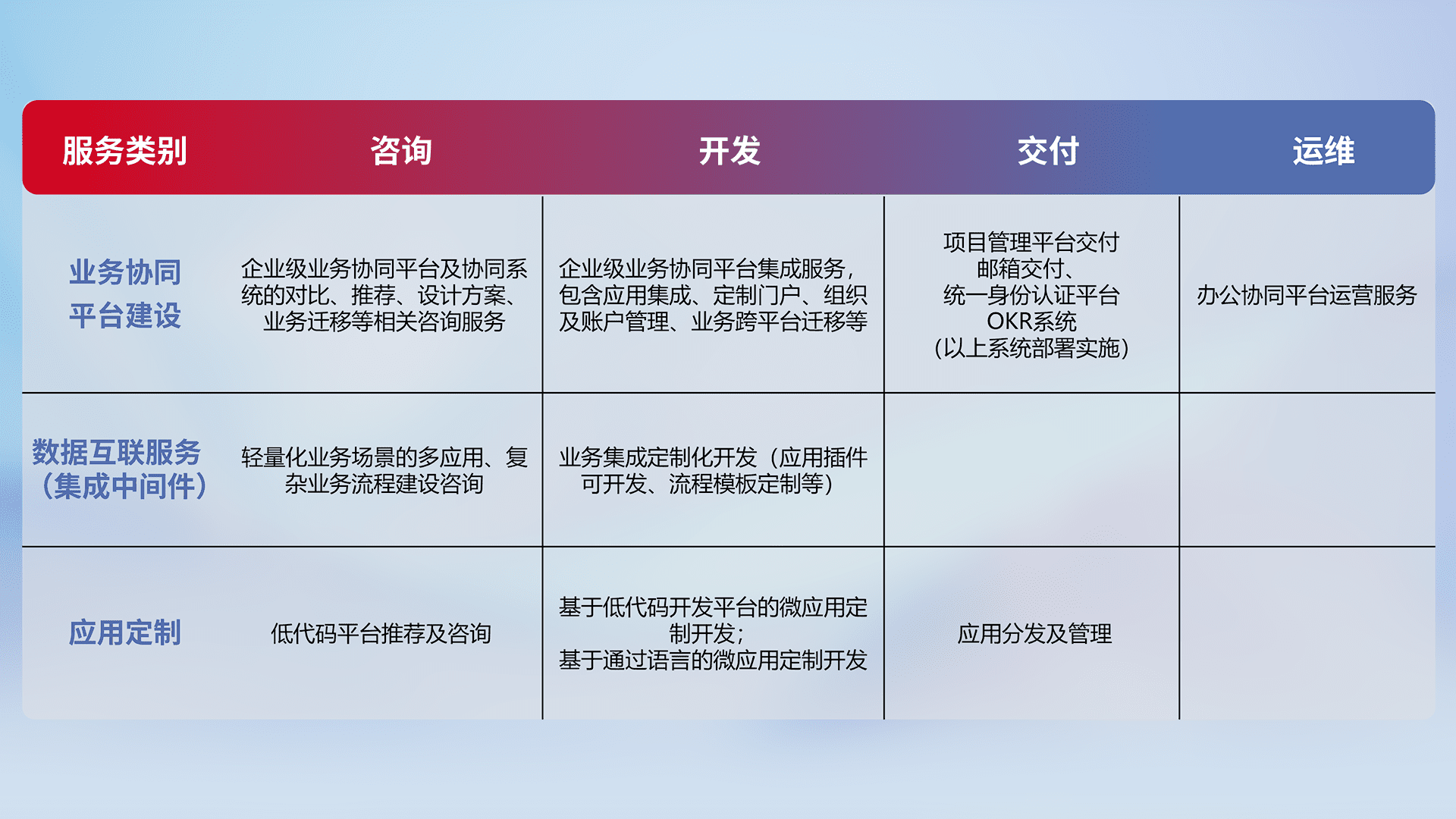 针对钉钉、、、企微、、、IDaas等平台级产品提供产品的规划、、方案、、交付、、定制化开发等服务,,,,实现如统一协同办公、、智能客户服务、、、混合会议管理、、、智能数据查询、、等业务场景,,实现数字化转型。。