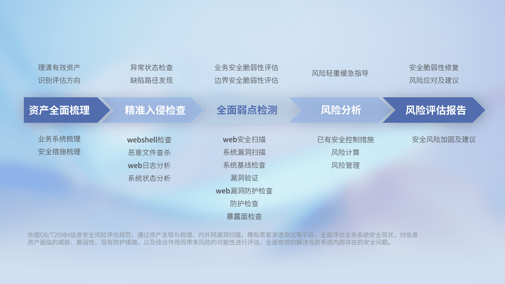 针对客户行业特性,,以专业的安全服务+多厂商联合解决方案提供专属的一站式安全管理服务,,,帮助客户全面感知网络空间威胁,,基于识别、、、、检测、、、分析、、防护、、、、监测、、、响应的服务理论模型,,,,从方案咨询、、、、集成交付、、评估验证、、、优化加固、、、、运维运营,,,致力于为客户提供完整的闭环管理式安全服务。。。以实战经验为客户打造高抵御风险的安全体系,,,,帮助客户发现威胁、、、、对抗威胁、、处置威胁,,,,不断积累安全对抗能力,,,,持续保障数字化安全。。。